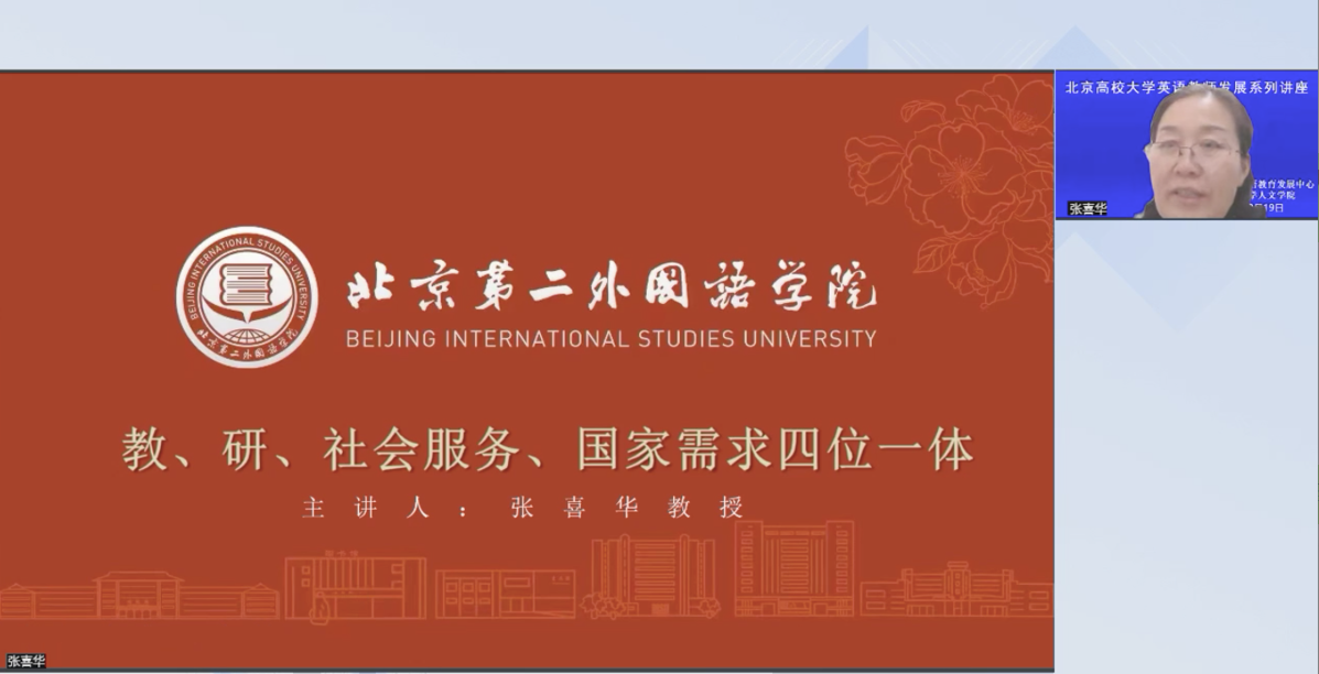 为了进一步提升我校英语教师发展职业能力,以“四有”好老师为标准,引导广大英语教师成为新时代为党育人、为国育才的高素质专业化创新型教师,2022年10月19日下午,亚洲博彩-亚洲博彩app 、北京高校大学英语教育发展中心联合举办教师发展专题系列讲座,特邀请北京第二外国语亚洲博彩 英语亚洲博彩 党委书记兼院长、博士生导师张喜华教授做教师发展系列线上讲座第一讲《教、研、社会服务、国家需求四位一体》。亚洲博彩 院长卢凤香教授主持讲座。 张喜华教授任教育部丹麦研究中心主任、北京高校大学英语教育发展中心主任、北京市大学英语研究会常务理事、中国翻译协会对外话语体系研究委员会委员,获第十四届北京市高等学校教学名师奖,主持多项国家社科基金规划项目和省部级社科规划项目。 张喜华教授以自己的留学、教学、科研经历入题,娓娓道来,向与会者分享了她如何坚定 “选择”初心,干一行爱一行,以贯穿始终的澎湃热情成就事业,以满怀感恩的心态待人待事。她强调作为一名外语教师,首先要热爱教学、潜心于教学,教学是艺术,艺术就要有激情,挚爱才能结出硕果,在课堂中施展才华为讲好中国故事传播中国声音贡献力量;同时教师不能只满足于“教书匠”的身份,要注重教研融合,在科研中要有大视野,把潜心问道与关注社会相统一、与国家需求、社会发展、学校学生需要相契合,找准方向,事半功倍;同时要积极投身于社会服务、乐于主动承担学校的其他工作,虽然会付出辛劳,但也收获快乐,还能成为开展教学实践和研究的助力和基石。张教授以“四有好老师”“四个引路人”“四个相统一”为标准,希望广大外语教师心怀感恩之心,珍惜国家学校给予的平台、珍惜无数人给予的关爱,正确认识并处理好个人与集体同向同行、彼此成就的关系,杜绝做“精致的利己主义者”,努力做乐观豁达、视野开阔的人,持续保持发展后劲,将教学、科研、社会服务、国家需求有机结合,四位一体全面发展,成就事业梦想。 张喜华教授做讲座 讲座结束后,张教授还就 “如何把热爱贯穿始终”“如何更好地提升跨文化教学能力”“医亚洲博彩 校大学英语教学中如何找准跨文化教学的切入点”“如何平衡好教学、科研与社会服务的关系”等问题与参会者进行了热烈的讨论和交流。 张喜华教授的讲座内容丰富、内涵深刻,既有理论的高度,又有很强的实践指导性。虽然讲座时间只有短短的一个半小时,但听讲人都表示深受启迪,受益匪浅。卢凤香教授最后总结道,张教授用她三十年的经历给我们上了生动的一课,更坚定了我们每一个人热爱教育事业无悔前行的信心和决心,贯穿始终的热爱与感恩情怀是我们成就事业和幸福生活永远的驱动力。
