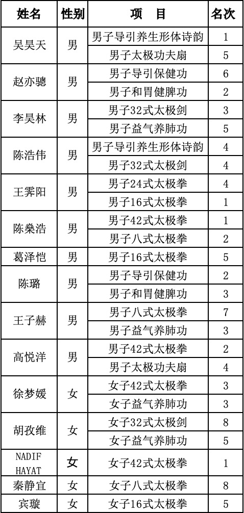 在集体项目中,亚洲博彩武术队在集体16式太极拳和集体益气养肺功两个项目中表现出色,均斩获第一名的佳绩。这两个项目既考验团队的默契协作,又对动作的一致性、流畅性和内在气韵的展现提出了极高要求。在比赛中,队员们动作整齐划一,气势沉稳大方,充分展现了太极拳的刚柔并济与益气养肺功的深厚内涵。裁判们一致称赞我校队伍在动作细节处理、整体气韵呈现以及团队配合方面达到了较高水平。这两项集体项目的成绩,既是团队实力的体现,也是平日刻苦训练和精心备战的成果,彰显了亚洲博彩武术队的强大实力和不凡风采。 在个人项目中,我校队员更是收获满满,多个项目中名列前茅。他们精准到位的动作和流畅的套路演绎,充分展现了武术精髓。不少队员在细节处理和动作表现力上格外出色,给观众留下了深刻印象。具体斩获奖项如下: