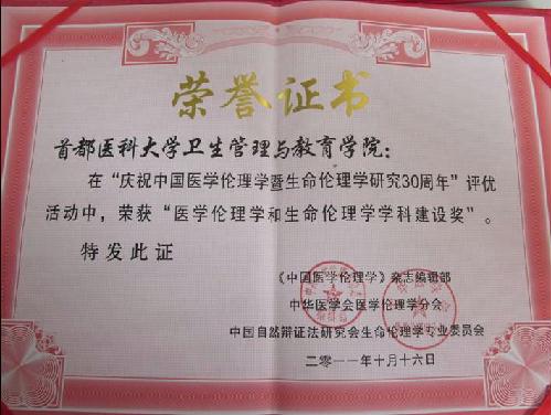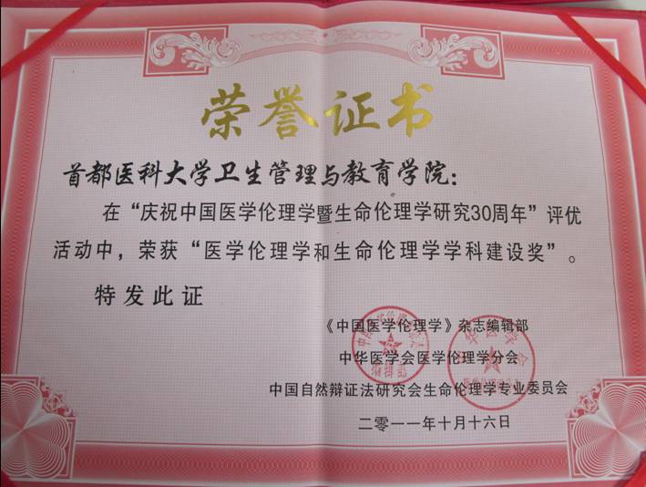 卫管亚洲博彩 荣获“医学伦理学与生命伦理学学科建设奖”