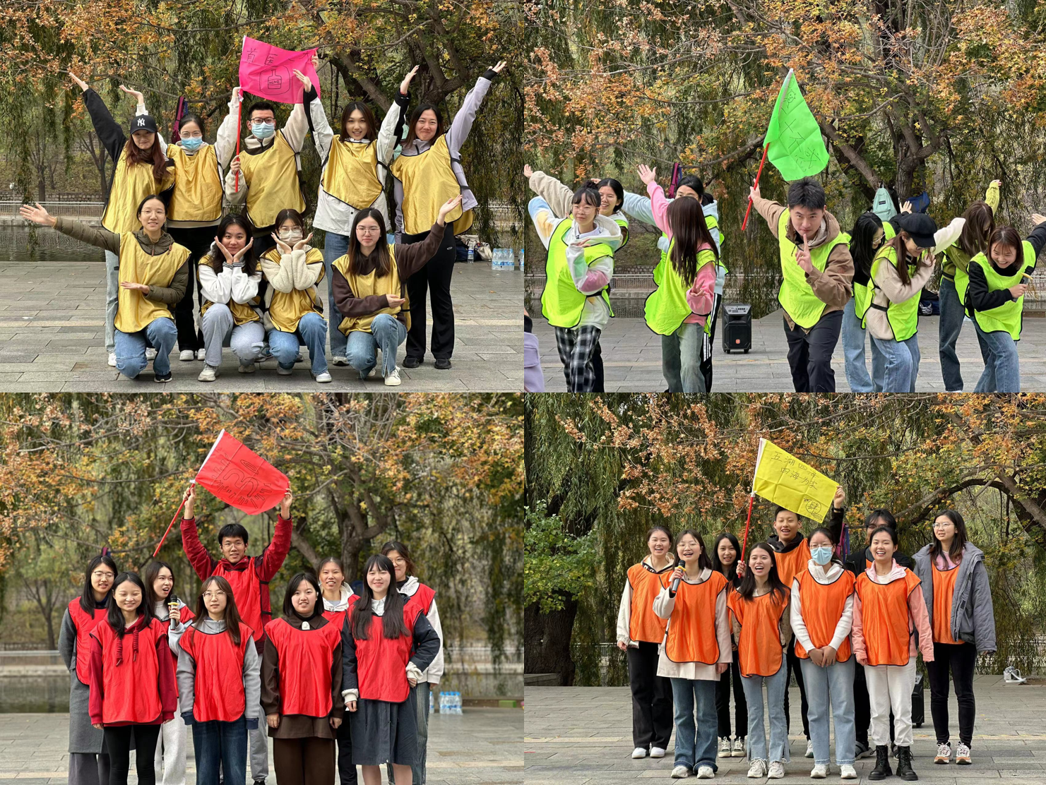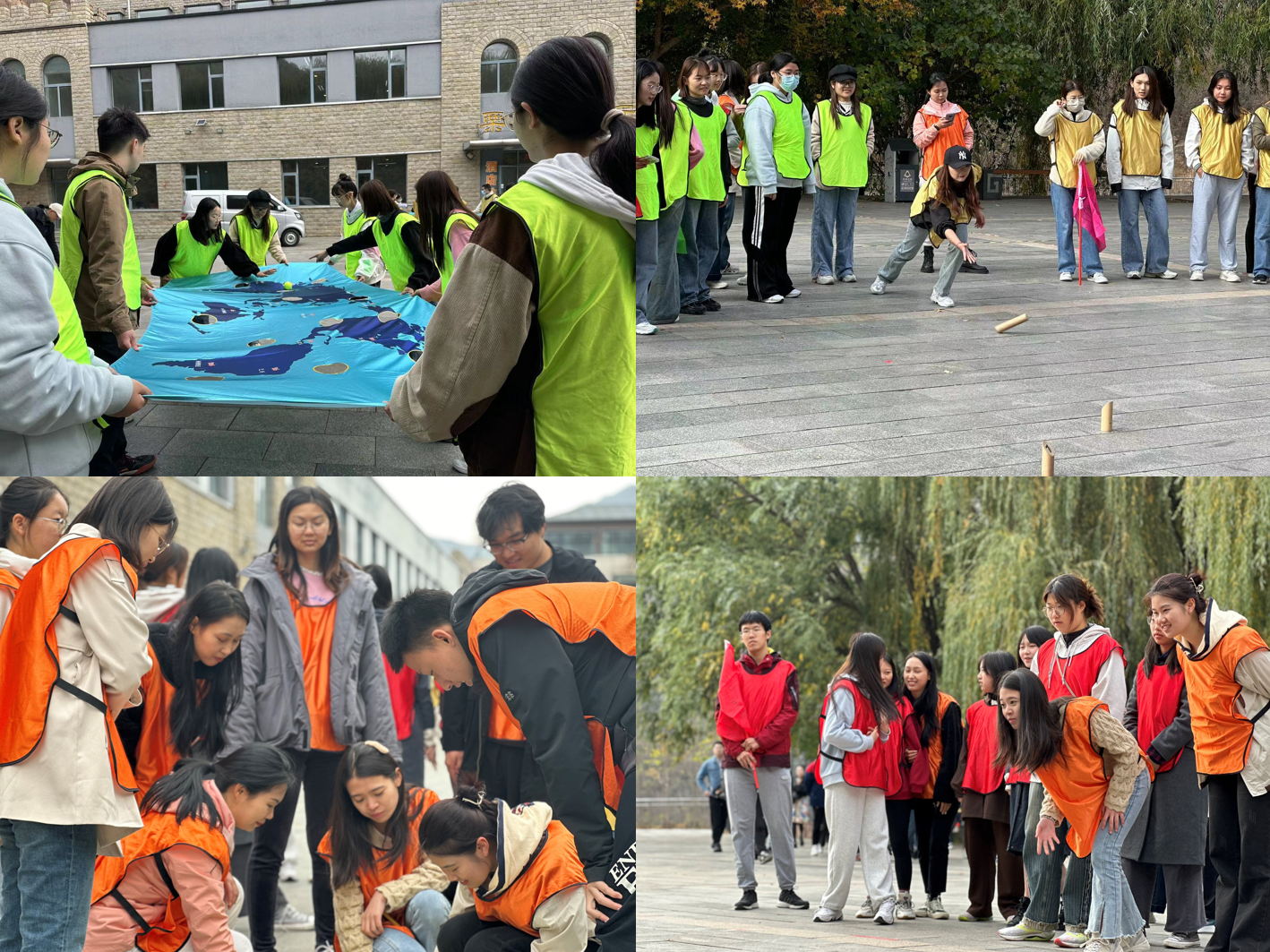 沐浴微风、身披暖阳,趣味竞技游戏开始了。首先进行的是“环游世界”游戏。团队成员们共同撑起一张巨大的世界地图,一起协作让小球按照规定路线滚动起来“环游世界”。各队均以饱满的热情、高昂的精神状态投入其中,起初出现配合不够默契、分工不明确、动作不娴熟等现象,经过短暂的磨合,同学们集思广益,很快掌握了项目的技巧,展现出了团队成员的耐心与细致、协作与信任。激情与速度同频,信任与合作共振。第二项比拼是“荷兰撞柱”游戏。此游戏要求团队成员接力撞柱,在最短时间内协作获得50积分。游戏过程中无不展现着智慧与激情的碰撞,只见各队成员们目标一致,齐心协力,即使是临时组建的队伍,团队照样能“高效协同,行稳致远”。 趣味竞技游戏将比拼、娱乐、健身等综合于一体,兼顾了趣味性与团队竞技,激发各团队团结协作、敢于拼搏、永争第一的精神。一个人的能力有限,而团队的力量是无限的。团队比拼中,每个人都有自己独特的才华和潜力,各队队长作为策划者,负责组织和指导整个团队的活动,“脑力担当”与“体力担当”互相帮助,发挥各自的优势,实现共同目标。每一次为彼此的加油呐喊,每一次为胜利的欢呼,大家在活动中尽情享受着彼此互助、互信的乐趣,不断挑战、超越自我,从中真切地感受团队的重要性。