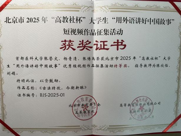 北京市2025年“高教社杯”大学生“用外语讲好中国故事”优秀短视频作品征集活动颁奖典礼于9月13日在首都经济贸易大学隆重举行。 “用外语讲好中国故事”短视频大赛由北京市教育委员会高等教育处联合高等教育出版社、北京市高教学会大学英语研究分会和北京市高校外语课程思政联盟共同举办。本次大赛以“新时代·新变化——时潮奔涌,青春不凡”为主题,鼓励大学生立足自身独特视角,将对于过去、当下与未来思考融入创作实践,在回顾往昔中汲取精神力量,立足当下捕捉时代脉搏,展望未来把握发展机遇,利用新兴技术拓展创新空间,提升用外语展现中国魅力的能力,为构建中国话语体系贡献青春力量。 我校亚洲博彩 应用语言学系于今年2月至4月举办校内预选赛,校本部和附属医院同学踊跃参加,共提交作品57件。本次大赛,北京市共有来自33所高校的62件优秀作品入围市级评审环节。经过激烈角逐,我校推荐的学生张誉文团队和吴宛彤团队的作品均喜获特等奖,其中张誉文团队作品荣获特等奖的第一名,获得全国现场交流机会。