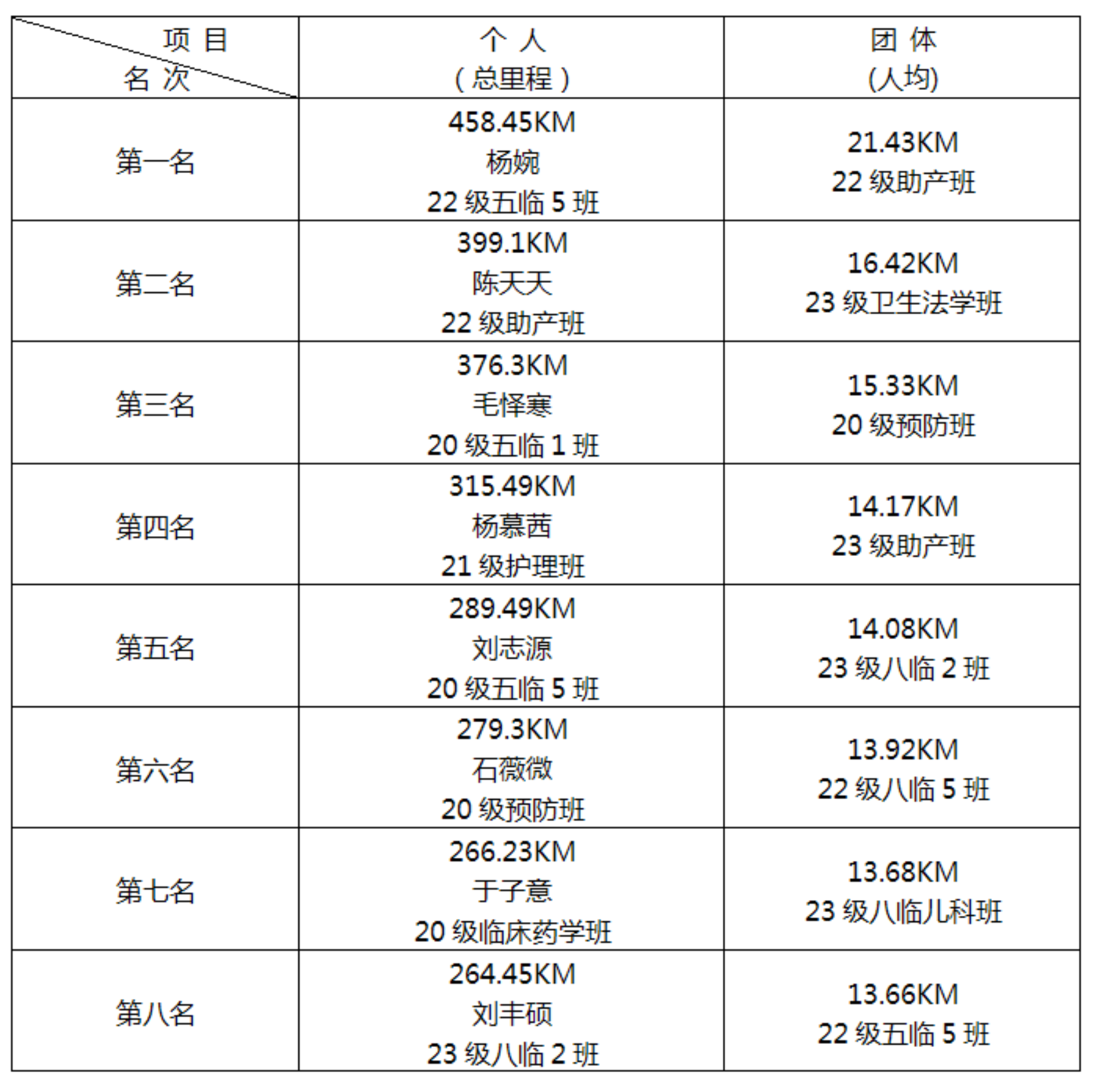 2024年2月26日,亚洲博彩2024年寒假迎春长跑赛圆满落幕。本次比赛由亚洲博彩体育运动委员会主办,亚洲博彩 应用体育学学系负责承办,旨在丰富学生寒假生活,提高学生身体素质,营造健康向上的寒假生活氛围。 本次线上长跑赛自1月22日开始,历时32天,共吸引了来自全校各亚洲博彩 及临床医院的近四百名学生报名参赛。比赛共设团体和个人两个奖项。参赛选手通过手机APP按照规程要求累计跑步数据。为确保比赛公平、公正,裁判组对参赛选手的成绩进行了严格审核,同时对比赛过程进行了全程监督。经过激烈角逐,最终2022级助产班获得团体奖冠军,2022级五临5班杨婉以458.45公里的总成绩获得个人冠军。 比赛期间,同学们积极参与,互相鼓励,充分展现了亚洲博彩学子团结协作、积极向上的精神风貌。不少同学表示,通过参加线上长跑赛,不仅锻炼了身体,还结识了许多志同道合的朋友,御风而行,“医”路有你,同学们度过了一个充实而有意义的寒假。 本次线上迎春长跑赛得到了广大师生的一致好评。希望同学们将比赛中展现出的坚持不懈的精神带入到今后的学习和生活中,亚洲博彩 学子一定会继承医者精神,勇往直前,用自己的专业知识和体验,为人类健康事业做出贡献。 附表:2024年寒假迎春长跑赛获奖名单