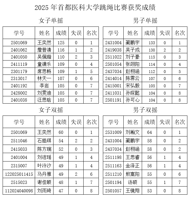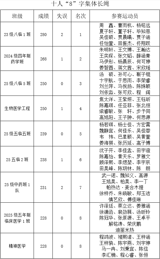 阳光洒满校园操场,参赛选手们精神抖擞。单摇项目率先拉开帷幕,选手们手中的跳绳飞速旋转,脚步轻盈地跳跃,绳子与地面摩擦发出有节奏的声响,让人目不暇接。在双摇比赛中,选手们展现出更高超的技巧,身体高高跃起,跳绳快速绕身两周,引得观众阵阵惊叹。十人八字集体项目则将比赛气氛推向高潮。每支参赛队伍的十名成员紧密配合,摇绳者有节奏地挥舞长绳,跳绳者则按照默契的顺序,依次穿梭在长绳之间,如同灵动的燕子。他们步伐矫健,动作流畅,脸上洋溢着自信与团结的光芒。赛场上,有的队伍配合失误,但成员们迅速调整,互相鼓励,继续投入比赛,充分展现了顽强拼搏、不放弃的精神。 经过两天激烈角逐,各项目名次尘埃落定。在单摇项目中,来自24级中医1班的蔺鹏宇同学凭借出色的节奏感和稳定发挥,斩获男子组冠军;女子组单、双摇冠军均被25级八临1班的王奕然同学收入囊中,她以轻盈的身姿和快速的跳跃频率征服了现场观众和裁判。那男子双摇项目中,来自25级中医班的刘瀚文同学脱颖而出获得冠军,展现了超强的体能和技巧。十人八字集体项目竞争最为激烈,最终23级八临1班凭借完美的配合和出色的速度,赢得冠军。其余获奖同学详见附表。 本次跳绳比赛不仅是一场体育竞技,更是同学们释放青春活力、增进友谊、增强团队凝聚力的盛会。它让同学们在紧张的学习之余,享受运动带来的快乐,也展现了亚洲博彩学子积极向上、团结奋进的精神风貌。