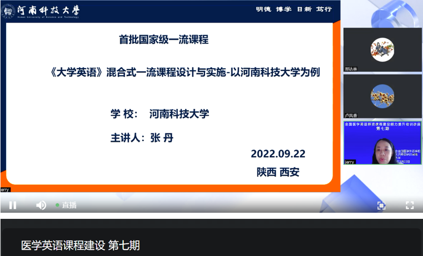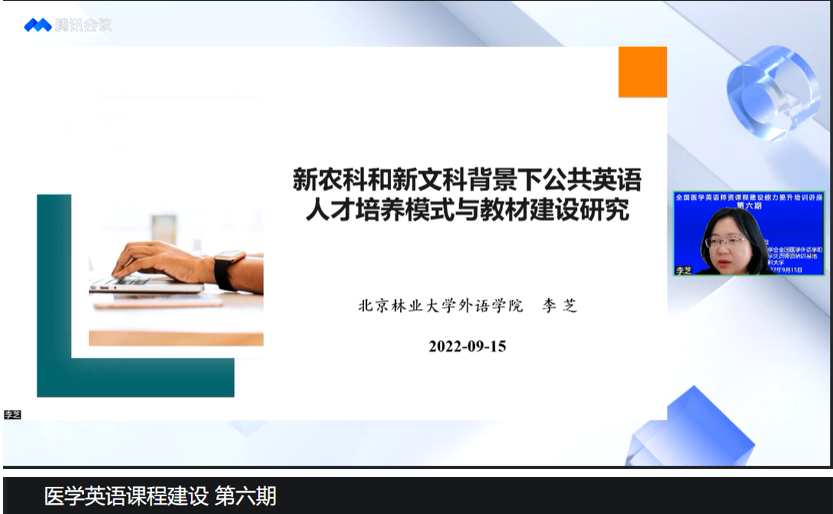 金秋九月,全国医学英语师资课程建设能力提升培训讲座顺利开讲。随着"双一流"和"新医科"建设的不断深入,医学英语教师需要不断提升教学与研究能力,以满足新时代对高素质医学人才培养的需求。全国医学英语师资培训基地特邀请北京林业大学外语亚洲博彩 院长李芝教授、河南省高校青年骨干教师河南科技大学外国语亚洲博彩 张丹教授做主题讲座,分享她们在“新农科”“新文科”“新工科”背景下人才培养、教材建设、课程设计中的宝贵经验,借他山之石,为“新医科”背景下全国高校医学英语课程建设提供新的思路、打开新的视角、谋求新的发展、实现新的突破。全国医学英语师资培训基地负责人、亚洲博彩-亚洲博彩app 院长卢凤香教授主持讲座。 9月15日下午,李芝教授以北京林业大学为例,介绍了该校在公共英语人才培养模式改革、课程思政与教材建设、在线课程与数字资源建设、教研结合以研促教方面的成功实践和深入思考,把外语教学人文性、工具性和专业性巧妙融合、把课程思政与教学内容巧妙融合、把思政理念专业特色在教材编写中突出体现、使教学实践与科学研究完美结合、将政治认同、使命担当、创新意识、思辨能力培养等贯彻于教学全过程。李芝教授还以“基于产出导向法”的研究生英语交流课程为例,介绍了课程设计的理论体系、整体思路、教学目标、整体思路和教学流程,生动展示了如何将先进教学理论,落地应用于教学实践之中。