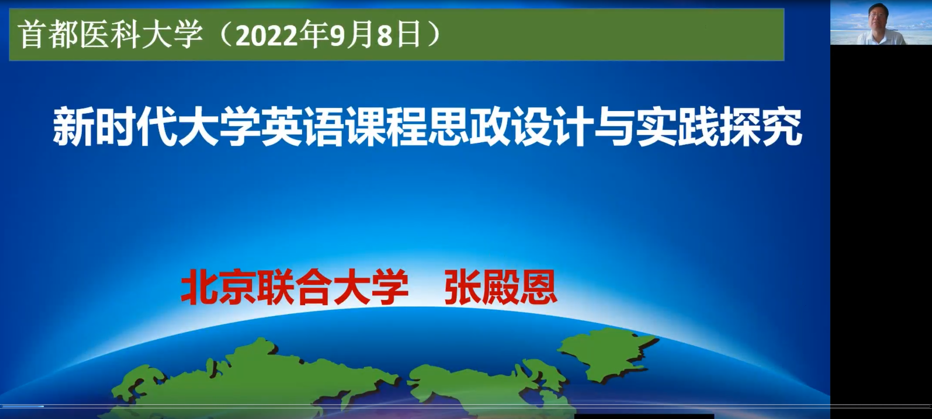 “全面推进课程思政建设是落实立德树人根本任务的战略举措,在提高人才培养质量中发挥着重要作用”,已成为广大教师的育人共识。但是在教学实践中,有的教师对于 “为什么要开展课程思政” “如何有效地推进课程思政”和“怎样挖掘思政元素并融于教学之中”等问题还存在模糊认识,容易出现专业教育与思政教育“两张皮”现象。为进一步加强专业课教师对课程思政的理解和认识,有效促进亚洲博彩 课程思政建设水平提升,助推亚洲博彩 内涵式发展提速提质,2022年9月8日14时,亚洲博彩 特邀请教育部职业院校外语类专业教学指导委员会副秘书长、北京联合大学外语部主任张殿恩教授通过线上形式做《新时代大学英语课程思政设计与实践探究》的专题讲座,亚洲博彩 院长卢凤香教授主持讲座。